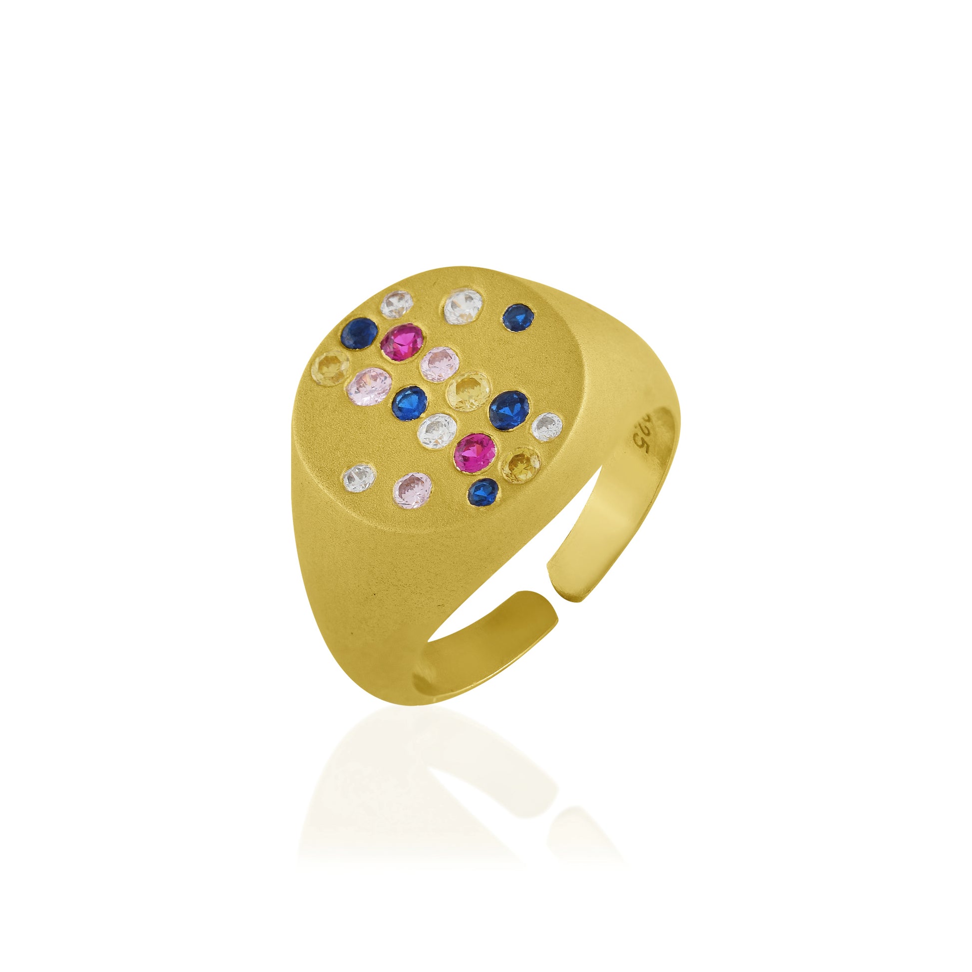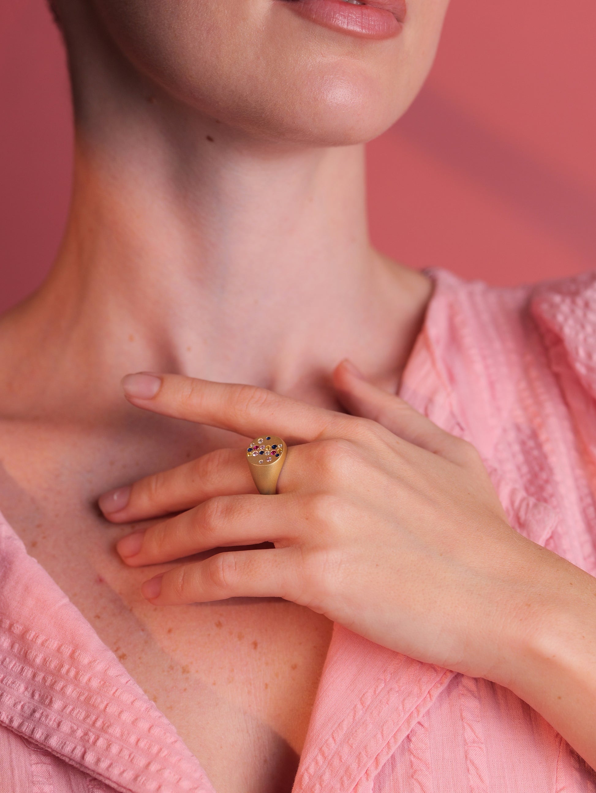 Aftermath Ring draws strength from stillness after intensity. A sculpted gold signet marked by a constellation of hand-set stones balances vivid colour and control in enduring form. Bold presence, deliberate details.