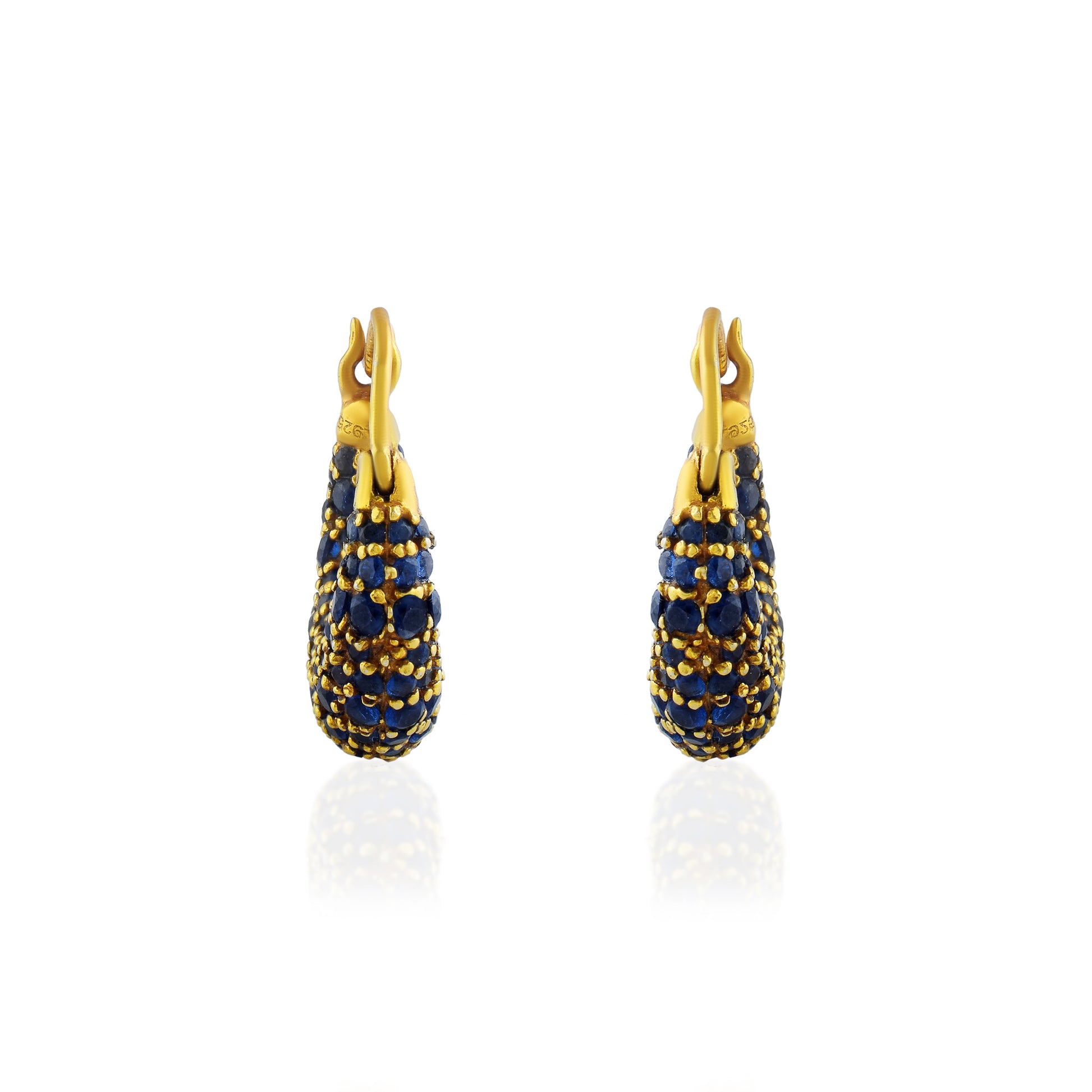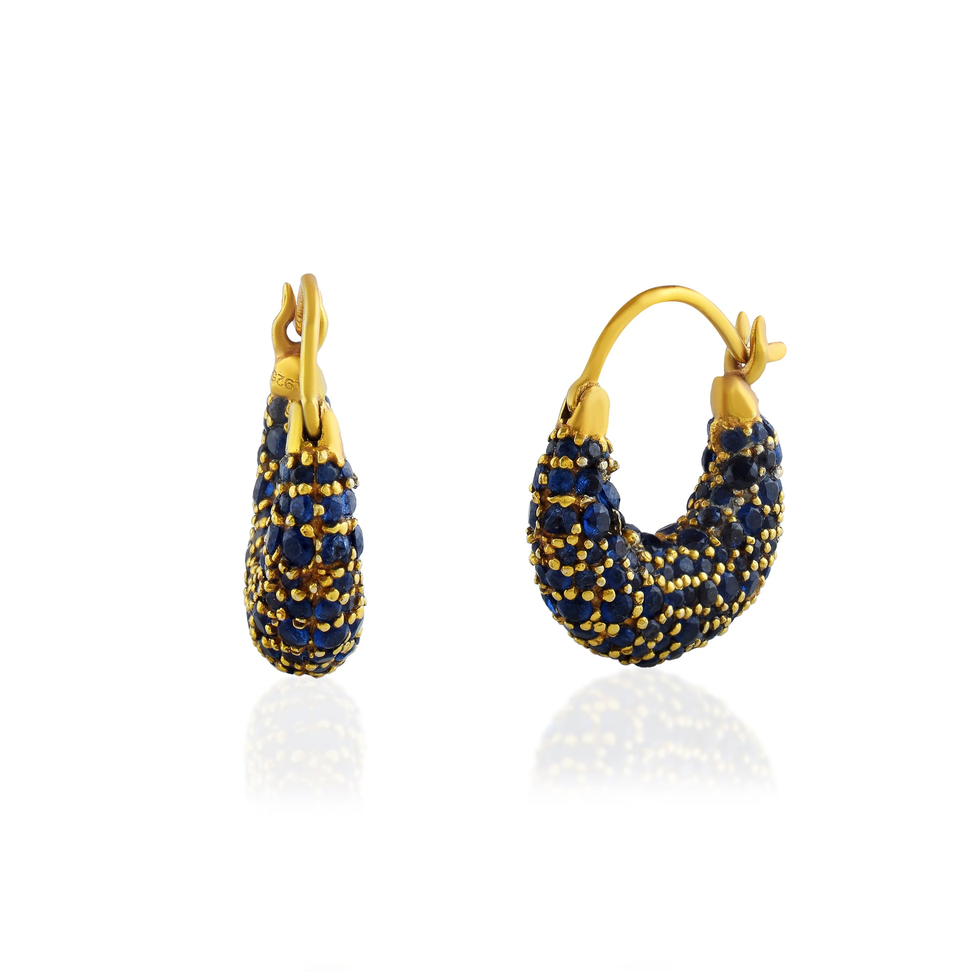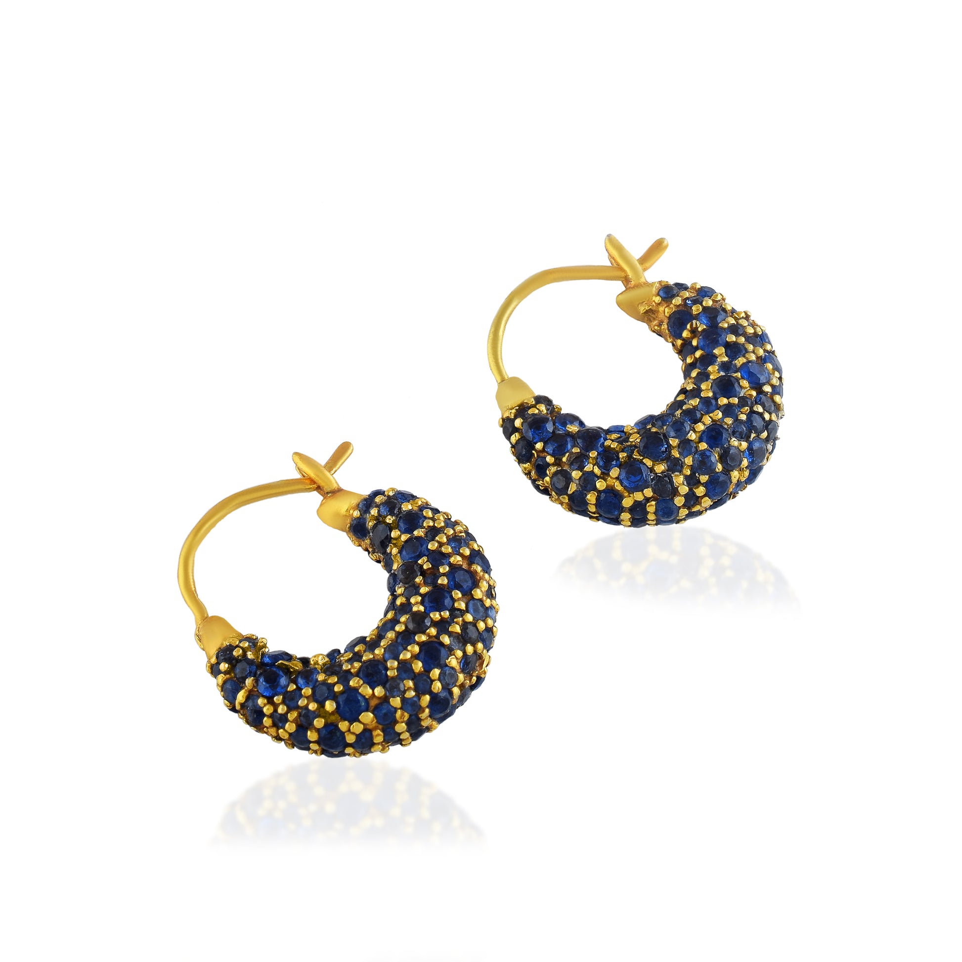 Boldly curved to hug the ear, these hoops fuse cosmic drama with wearable intensity, pavé deep sapphire tones dancing against the gold tones. They echo the allure of a lunar eclipse—where edge meets opulence with quiet confidence.