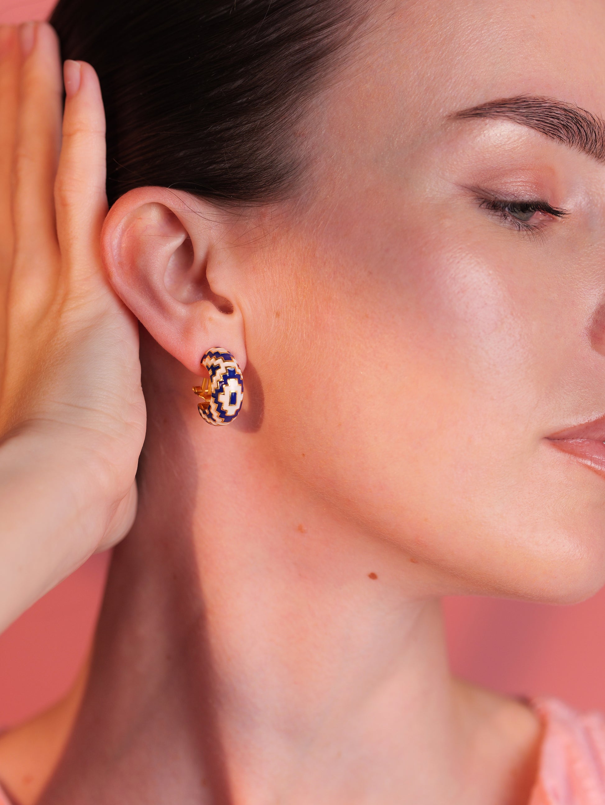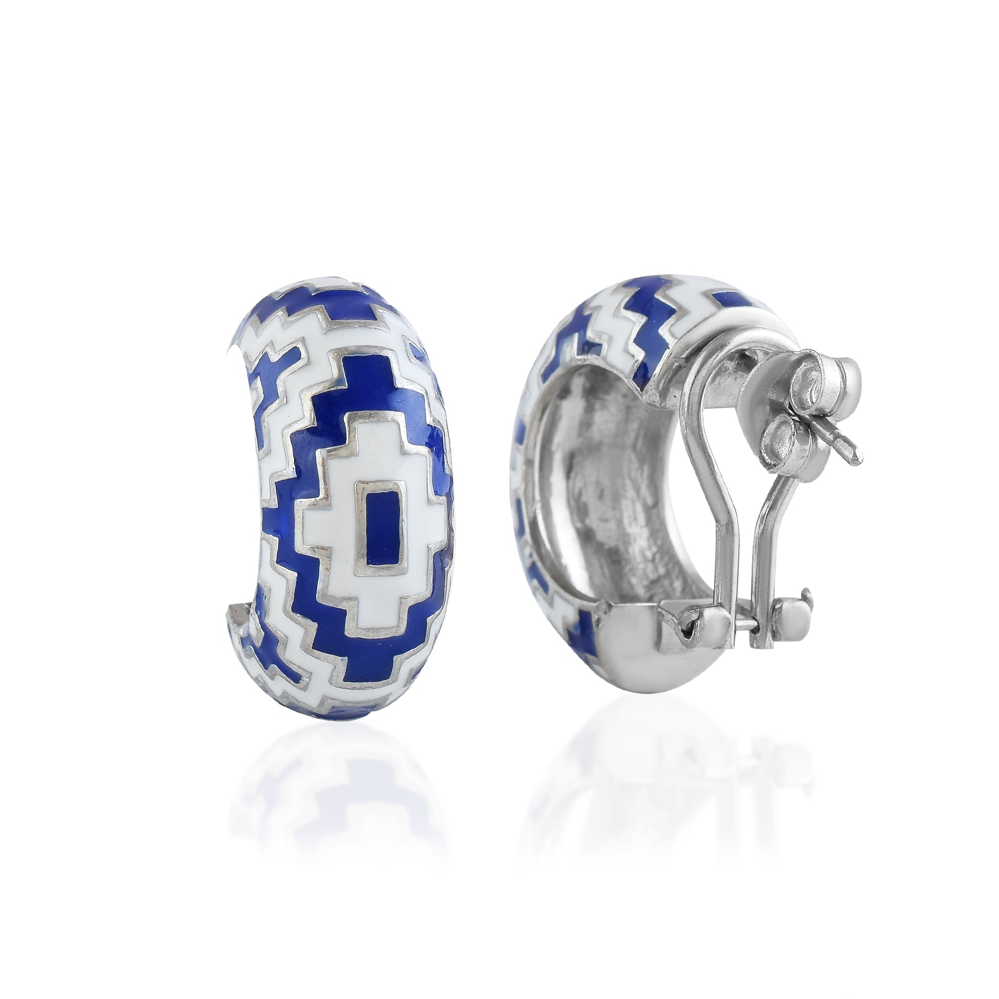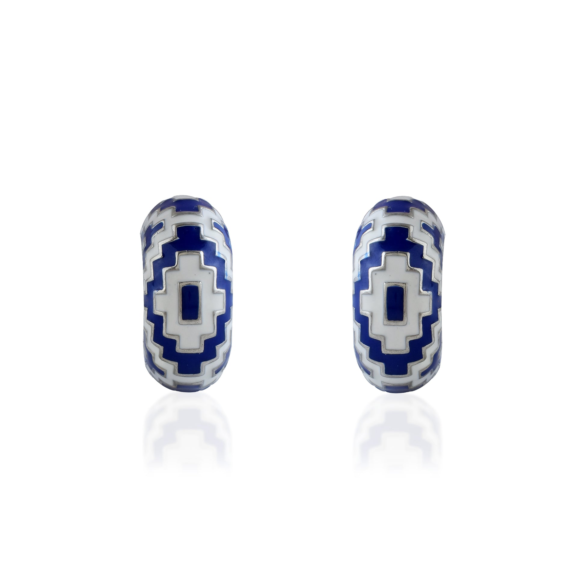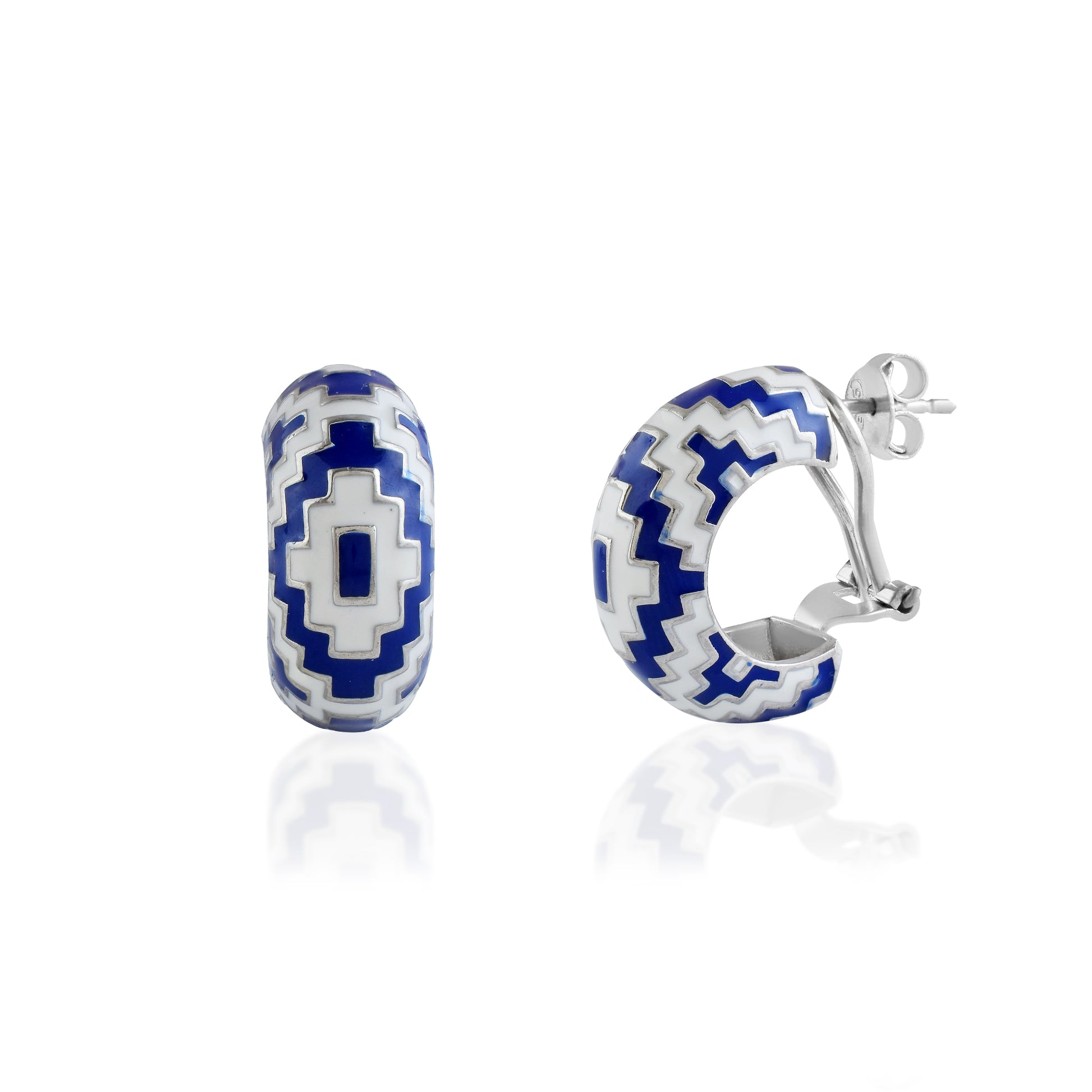 Zulu Code Hoops decode ancient geometry through bold blue-white enamel. Rhythmic patterns pulse across sculpted silver cuffs, radiating defiant individuality.